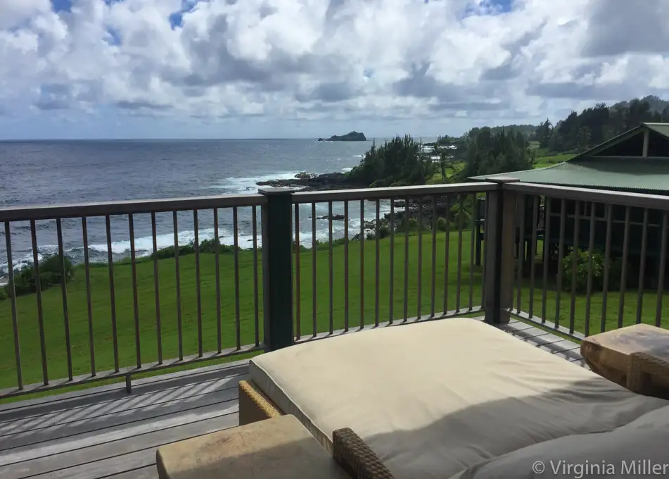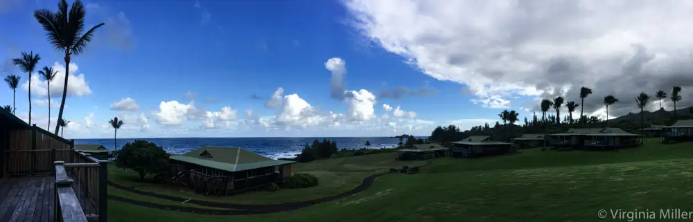 Grass fields and palm trees roll down to the sea, while lush lawns and hills are dotted with modern Hawaiian plantation-style cottages, adjacent to the main “lodge” up the hill.