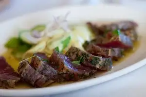 Bisque de Crevettes ($9) is a creamy, rich shrimp bisque seasoned with apples, sweet onions, dill and white wine. The shrimp nearly melt with tenderness and dill plays a dominant role. Ahi Tuna Crudo ($15) was generously portioned: a row of delicate, flash-seared ahi with an avocado salad that was too heavily drenched in a lime/ginger/habanero dressing.