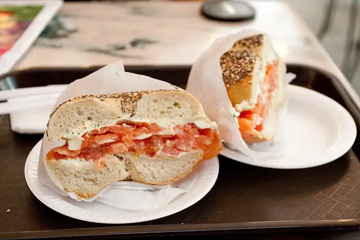 ESS-A-BAGEL, Gramercy- Where Russ & Daughters’ bagel & lox is fresh and crisp, Ess-A-Bagel is hefty and delicious. I like the 70’s wood-paneling with chandeliers and sweet, no-nonsense staff at the out-of-the-way Gramercy location. There I ordered an “everything” bagel with lox again (piled high and generous, by the way), but as most of their cream cheeses were of the sweeter, cinnamon kind, I chose vegetable cream cheese. I pretty much fell in love with this bagel. Seriously. I’ll have another.