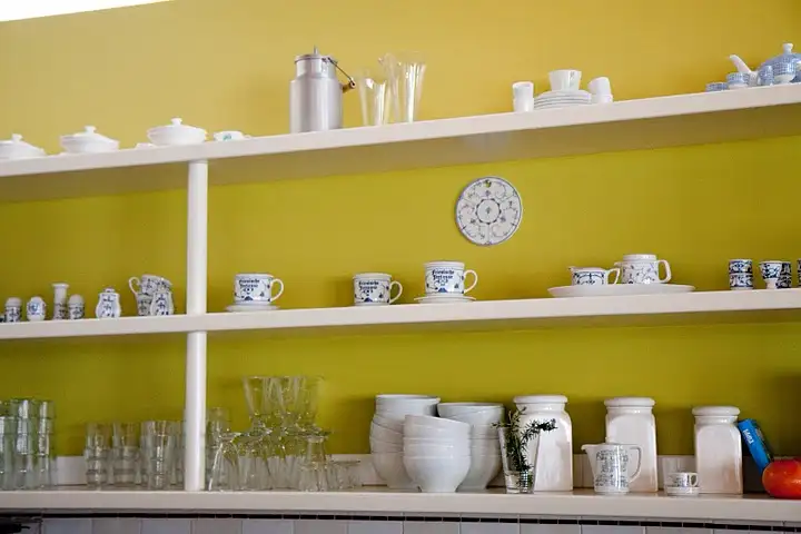 German china lines shelves behind the counter