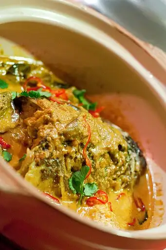 My favorite may be the 3-lb. fish head in tamarind curry ($15.88). Served in a giant pot, the fish head holds fall-off-the-bone, flaky fish meat (beware the eyeballs! Eat up the tender cheek meat!) It rests in a bold, coconut milk, shrimp paste, spice-heavy curry that is creamy, textured. Okra dots the dish, as do Fresno chilies. Pickled in vinegar & sugar, these chilies were so good, adding a needed contrast to the rich sauce, that I asked for a side of more. With South Indian roots, this dish is an example of Nonya cuisine (a mix of Malaysian, Indian, Chinese foods), and is served at celebratory meals in Malaysia.