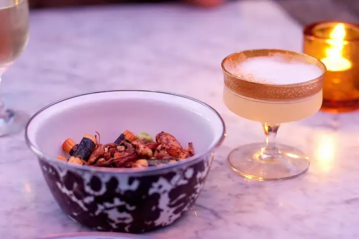 While every dish does not wow, the price is right and most of all, Choi clearly has fun with his menus, as do you eating his food. Snacks are the likes of chef’s roasted nuts ($5), a Japanese trail mix of sorts, with shredded beef jerky added in for good measure. Kitchen fries ($6) are so much more than fries. A few kinds of spud, from purple Okinawan sweet potato to Korean sweet potato, are fried lightly, then dusted with sea salt. Dipped in a midly spicy kimchi sour cream, there is no better accompaniment to drinks like the light, silky Mainland ($10) with pisco, lilikoi (passion fruit), lime, egg white, cayenne.