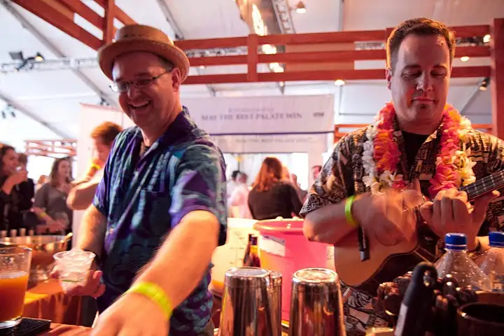 The boys of Smuggler's Cove, Steven Liles (L) and Marco Dionysos (R), keep it real with Marco's ukelele tunes and a winning cocktail of the night w/ Ron Brugal Extra Viejo Rum, passion fruit nectar, fresh lime & pineapple juice, demerara sugar, Luxardo Maraschino Liqueur, cinnamon, nutmeg