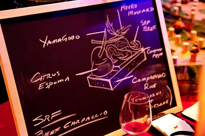 Bourbon Steak's (Chef Omri Afalo) creative beef carpaccio comes w/ chalk diagram pointing out elements like citrus espuma (foam) & micro mustard