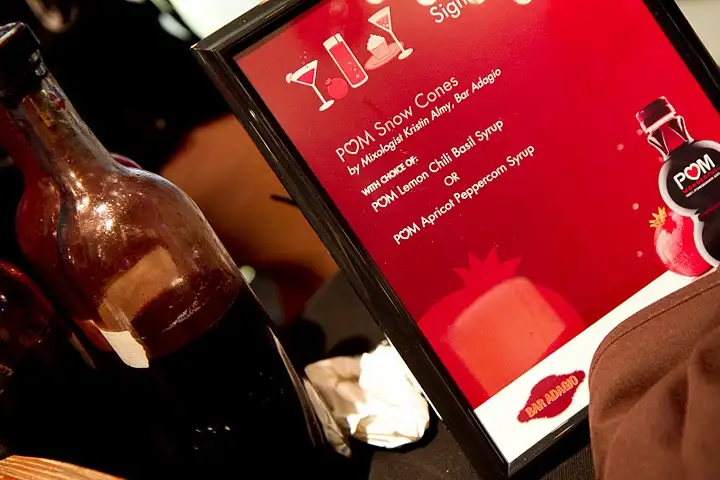 Surprising refresher in POM (pomegranate liqueur) Tent during a warm Saturday by Kristin Almy of Bar Adagio: POM Lemon Chili Basil or Apricot Peppercorn Snow Cones