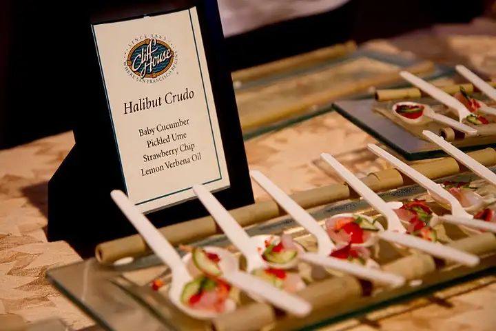 One of the best bites of the day: Cliff House's Halibut Crudo perks up w/ cucumber, pickled ume, lemon verbena oil and a strawberry chip