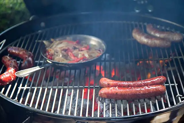 Sausages, onions and peppers on the grill at Tavern at Lark Creek