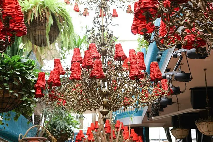 Colorful chandeliers in a glass ceilinged room of Cafe en Seine