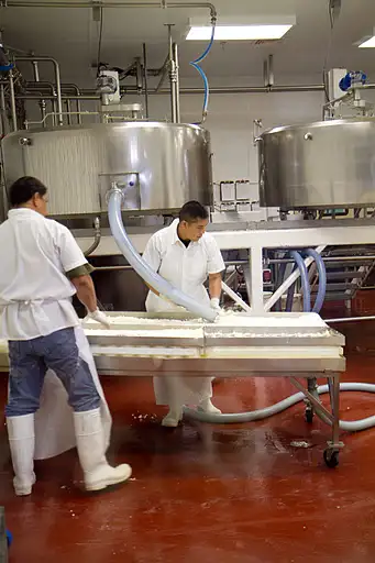 “Washing the curd” by hand from the pasteurizer before brining