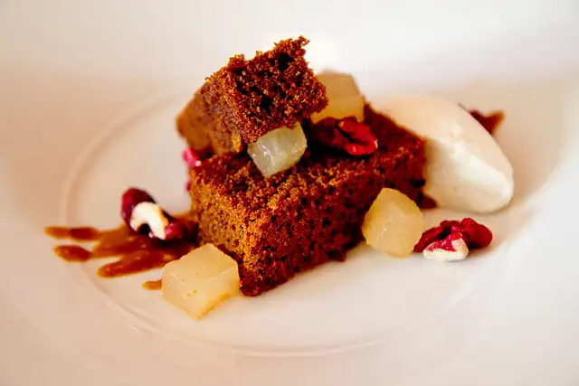 Desserts (desserts $6 lunch, $8 dinner) are equally expert in detail but didn’t capture me the way savory dishes like the veal breast, boudin noir, or charred avocado have. I enjoyed ginger cake with Asian pear and salted toffee, cooked in Amaro Montenegro, and a devil’s chocolate cake dusted in coffee and smoked streusel, with shavings of roasted white chocolate, though I could have used more smoked streusel to bring out the earthiness of the cake.
