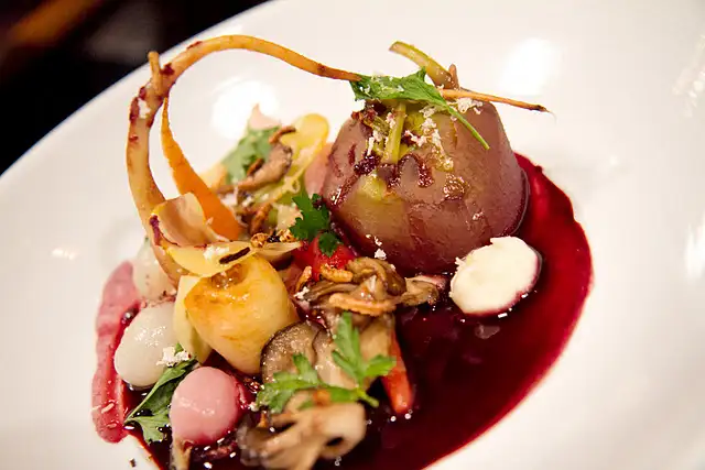 On the entree front, one witnesses Liberman’s range in a juicy, utterly satisfying slow-cooked veal breast (all entrees $24), subtly candied in orange, accompanied by unfried, plump sweetbreads and broccoli. He does not leave vegetarians in the shadows with Kohlrabi “Bourguignon”. Kohlrabi, a brawny German turnip, stands stoically in the center of the plate, a root sprouting from the dish with flair. Notes of horseradish and star anise peek out but it’s the red wine sauce that must be lapped up.