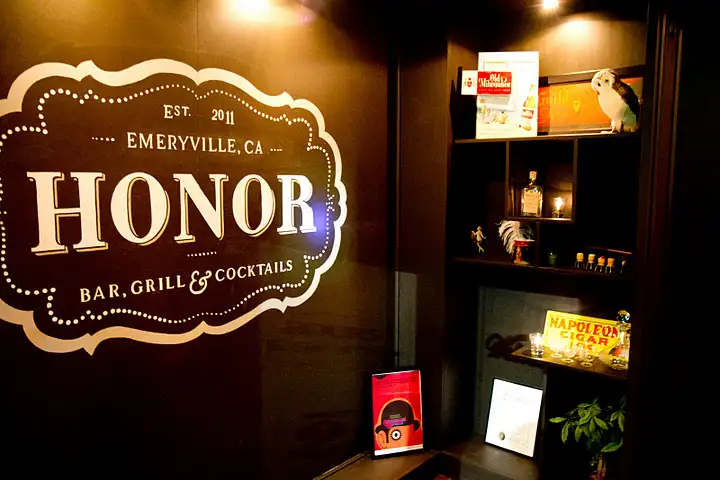 Situated in a solo building (with parking lot) not far from Emeryville’s shopping center madness (and E-ville’s other shining bar beacon, Prizefighter, which opened at the end of 2011), Honor Kitchen & Cocktails serves gourmet pub food in a room glowing with vintage signs, a Creature from the Black Lagoon pinball machine, and granite red bar, the center around which the space flows. After passing through an entrance lined with cigar signs, records, even an owl, grab a beer from a tub of ice. It’s on the honor system so ask a bartender to add it to your tab (no surprise: this is already garnering early buzz).
