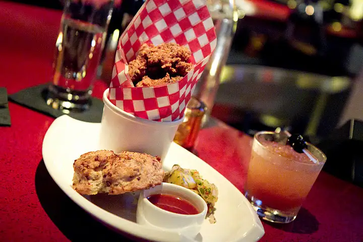Bell’s menu is decidedly playful, reminiscent of American childhood… with booze. The festive theme starts as you receive Chinese take-out boxes of fresh-popped popcorn, while bites of mini sliders and grilled cheese sandwiches are passed around. I had the most fun with Mad Hatter ($10). Sailor Jerry rum and a spicy ginger soda are obvious mates, but the bright orange, creamy drink surprises with golden raisin puree and carrot juice. Bright and healthy, spice and sweetness (but not too much) make it a delightful alternative to an orange creamsicle.