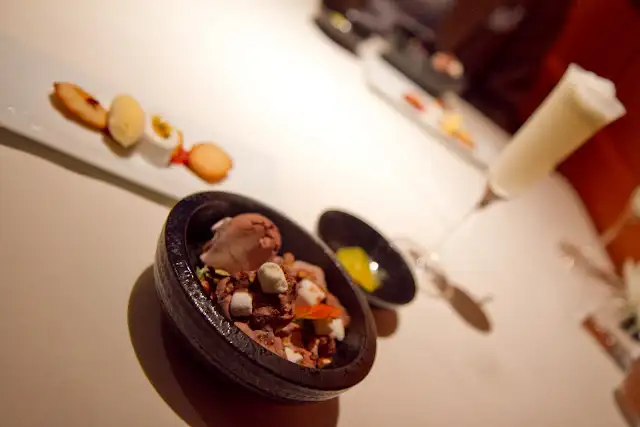 – Caviar parfait with green apple, puffed rice, carrot, smoked creme fraiche, gold flecks