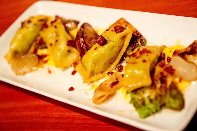Contrast raw scallop freshness with rich broccoli agnolotti ($11/$18), a pasta meaty with southern Tasso ham, savory with orange-hued mimolette cheese and cipollini onions. Its drink mate is a full-bodied, but not overwhelming, Hometown Vixen ($9). Bolton infused black pepper in Four Roses bourbon, mixing it with lemon and two house syrups: gomme and a luxurious roasted pistachio.
