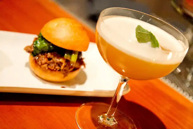 Another happy match occurs in braised fennel and watercress ($9), again far more satisfying than it sounds. Grilled fennel works beautifully with creamy burrata cheese and charred cherry tomatoes (a twist on a Caprese) over grilled toast. Its cocktail match is International Mistress ($11), a soft but powerful mix of amaro (Nonino) and mezcal (Sombra), luxurious with orgeat and grapefruit, with just a hint of mezcal smoke. Also more exciting than the overwrought sliders category would suggest are Chinatown duck sliders ($9), like a gourmet Chinatown sandwich with tender duck, shiitake mushrooms, bitter greens and a smack of bacon. Its cocktail pairing is the 5 spot ($10), a bright blend of La Favorite rhum agricole, lime, maple, house ginger and five spice syrups, crowned with a Thai basil leaf.
