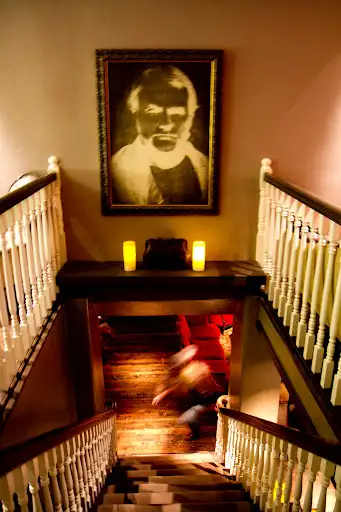 From the top of the stairwell, a tweaked photo of the house’s original owner