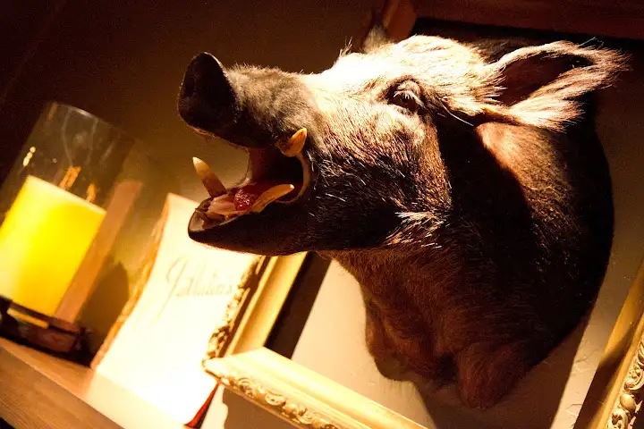 There’s an intimate, one table dining room (Gallitan’s Room) with a boar’s head standing guard over the fireplace and relics from the restaurant’s former incarnation as Gallatin’s, a restaurant where presidents and movie stars dined in decades past. Vintage and modern pieces combine, each room claiming a distinct personality. The bar is equally mesmerizing: an illuminated white onyx bartop glows under slanted roof rafters with coveted booth tables above gazing down over the bar.