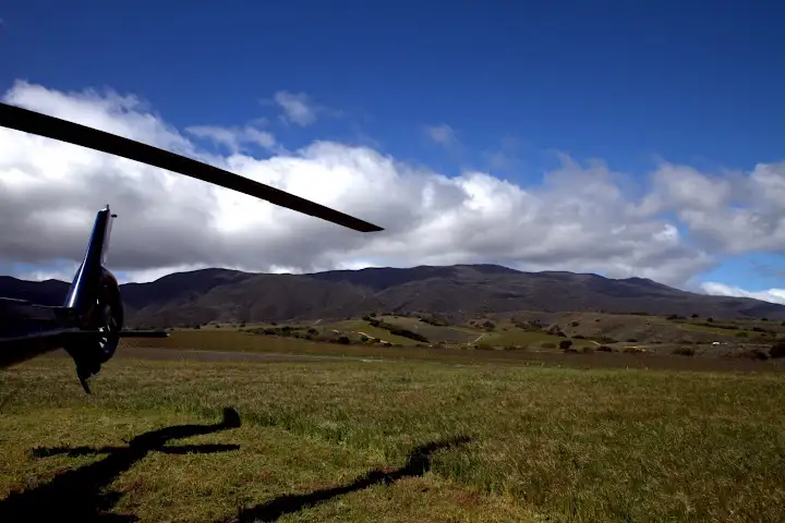 Landing in a helicopter at the base of the Santa Lucia Highlands for a Carmel Road vineyard wine tasting