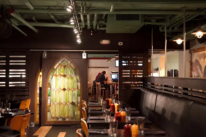 Despite early mixed reviews on the new barbecue restaurant, Russell’s Smokehouse, from the Bonnano folks (Green Russell, Wednesday’s Pie), I visited the basement restaurant less than thrilled with high prices for BBQ (yes, it is $24 for a combo plate), food pleased in the understated basement with church-like stained glass sliding