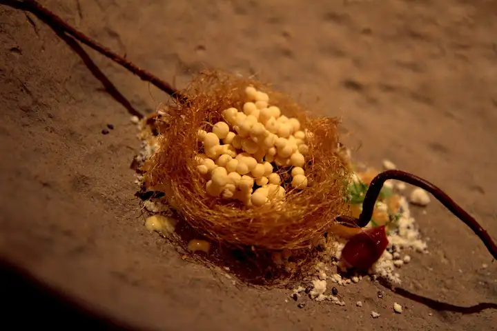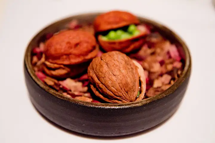 Besides her truly imaginative take on tomatoes, my other favorite Crenn dish arrived dramatically on a scooped stone slab graced with a chocolate branch and an edible, glistening silk nest filled with dehydrated vanilla pods over sweet corn and porcini mushrooms. Like a treasure found in an enchanted forest, the dish explored both savory and sweet whimsically, a feminine wildness tempered by refinement.