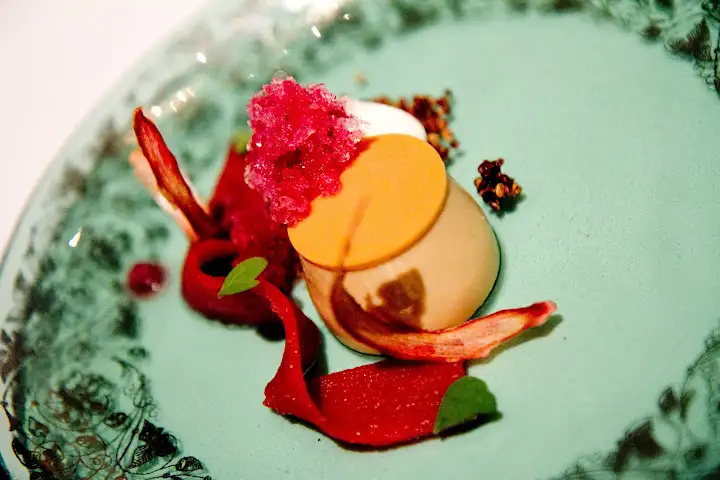 Unpredictable touches jump out, like Fox’s frozen “white snow” over corn pudding topped with grilled sweetbreads and tempura-fried okra (paired beautifully with a 2006 Pierre Morey Bourgogne Chardonnay), or another Fox hit: bone marrow puree animating hearts of palm, skinned red potato and poached ruby fish, happily paired with a cup of duck consommé tea. The meaty tea seamlessly interacted with the vegetables and bone marrow, highlighting masculine mischievousness in Fox’s stylish cooking.