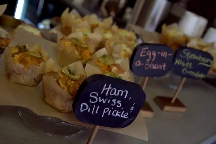 Foodies have a destination cafe/restaurant in Big Bottom Market, open since last summer by co-owners Michael Volpatt and Crista Luedtke (the latter owns neighboring boon hotel + spa and boon eat + drink restaurant), drawing crowds for breakfasts, lunch and cups of my favorite Sonoma County coffee, Flying Goat (their own special Big Bottom Blend). Their breakfast biscuits ($3-9) are stuffed with a changing array of goodness like bananas, peanut butter, strawberry white chocolate, or ham, Swiss and dill pickle (loved the mustard in the latter but was on the hunt for the ham). Offerings change daily and each biscuit is adorned with what’s inside.