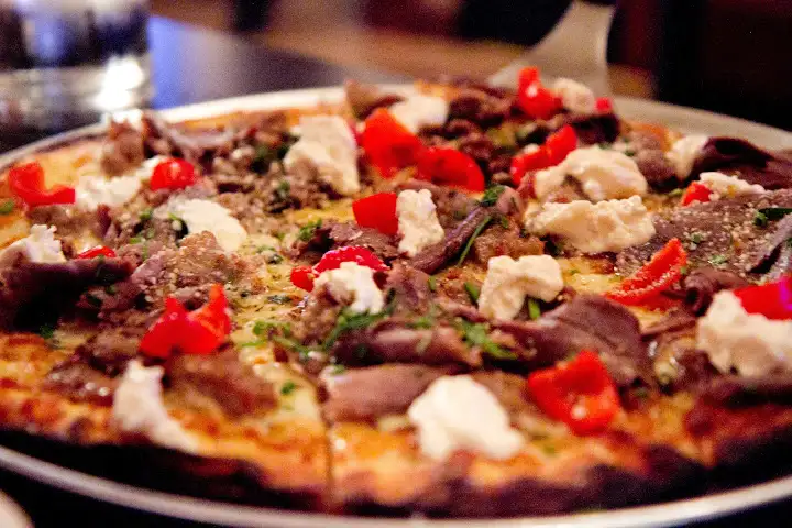 The Italian Stallion pizza, which I prefer in cracker-thin form, showcases Chicago-style Italian beef, heightened by a drizzle of horseradish cream and insanely good sweet-hot peppers you’ll find on a number of Capo’s pies. Flour-based crust gets texture and complexity from a dusting of cornmeal, while Tony reveals a key to its perfection: European butter and a bit of lard. Fresh cheese oozes, unlike chewy wads of low-quality mozzarella I’m faced with in some of Chicago’s venerable deep dish houses. If you have room and a warm whiskey crisp is available for dessert, get it.