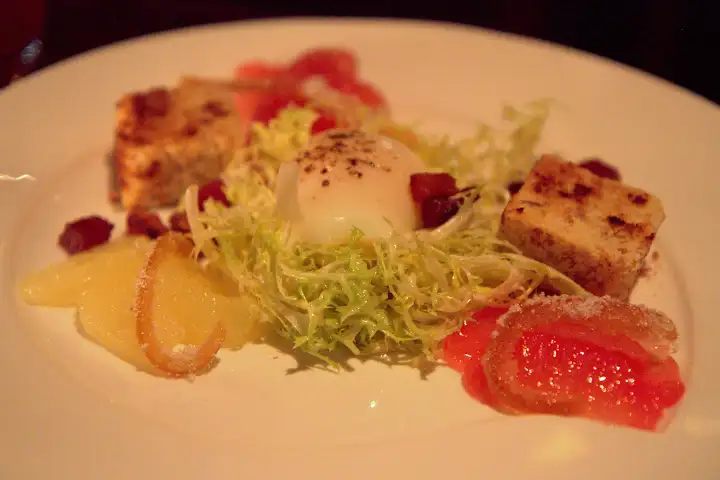 Chambers’ Salade Lyonnaise: grapefruit, pork biscotti, lardons, candied pomelo splay out spoke-like from a sous vide egg atop frisée
