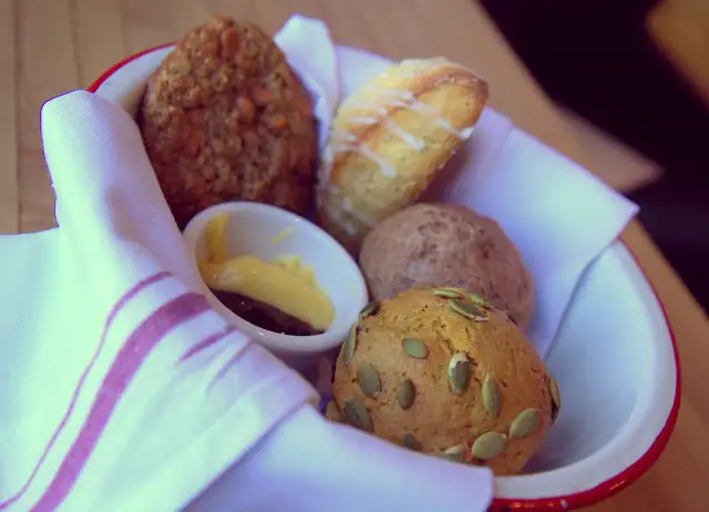 A basket of house breads ($9) is almost the brunch highlight: during my visit, it was pumpkin seed pecan and scallion cheddar muffins, and a yuzu-glazed coconut carrot scone with spreads of passion fruit curd and Black Mission fig-berry jam. French toast ($13) stuffed with banana and house hazelnut Nutella, topped with bacon is an optimal wake-up. Ditto their “BLAT” ($12 – also on the lunch menu), a massive sandwich of bacon, lettuce, avocado, and tomato, even better topped with a fried organic egg ($2).