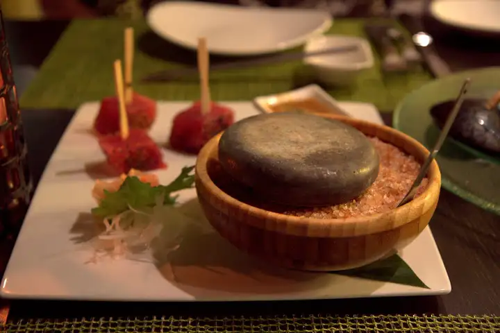 Ko combines the many cultural influences on local cuisine, from Filipino to Portuguese, in its Hawaiian dishes. Dishes are pricey ($20’s-$40’s for entrees) but not atypical for upscale dining in Hawaii. Standouts included fresh fish catch of the day crusted in macadamia nuts doused in tomato ginger butter with artfully whipped purple Molokai sweet potatoes. “Ahi On the Rock You Sear It” ($26) is a long name for raw ahi seared to your preferred degree over a stone, then dipped in shichimi-spiced orange ginger miso sauce. A presentation akin to what you might see at Morimoto restaurants. Live Hawaiian music from solo musicians on guitar or ukelele ideally suit the outdoor setting.