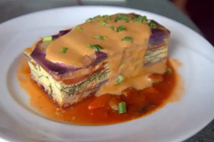 Napili Kai’s Sea House open-air setting is a dreamy beachside respite (7-11am daily), and easily the best breakfast I had in Maui. Unusual dishes are even artful, like a fluffy Molokai sweet potato egg frittata ($10), dramatic with local purple potatoes, laced with spinach, caramelized Maui onions, and cheese in a spiced hollandaise and vegetable ragout.