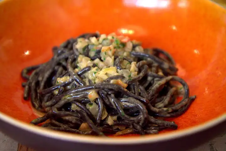 Also a pleasure: wood-fired pizza ($17) topped with nettles, ricotta dura (aged ricotta from Puglia, Italy), Fior di Latte mozzarella, or thick, spaghetti-like black noodles – bigoli neri ($16) – tossed with octopus, oregano and hot pepper.