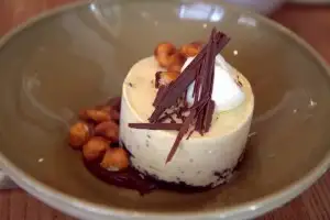 Finish with a cool dessert of stracciatella (chocolate chip) gelato formed into a cake, salted hazelnuts adding crunch.