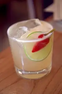 Campfire Fizz goes the smoky-refreshing route with Del Maguey Vida mezcal, Cherry Heering (cherry liqueur) and lemon, frothy with egg white and IPA beer.