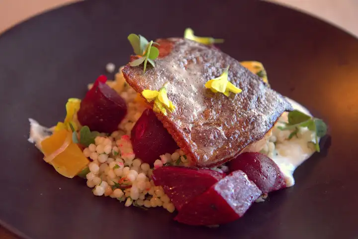 At Hillside Supper Club: Mount Lassen trout over Israeli couscous, marinated beets, horseradish yogurt
