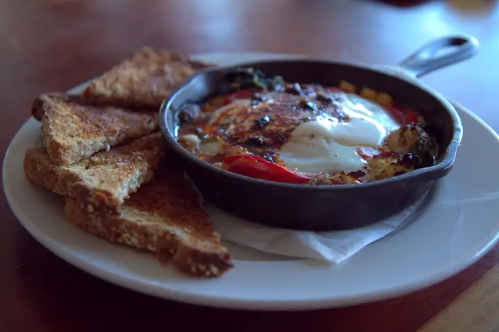 A weekend special ($11) consisted of garbanzo beans, eggs, red bell pepper, caramelized leeks, chard, and mini-cauliflower sizzling in a cast iron pot, creamy with Greek yogurt and chili oil. Redolent of garlic, the dish proves why breakfast is no afterthought here.