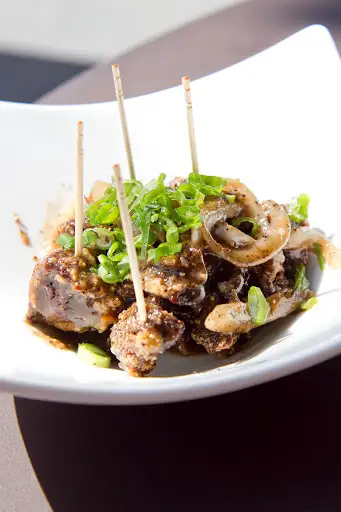 Highlights were on the raw/crudo side ($12-14), like sea bream in chili-lemon soy with radishes and mizuna, ahi tuna in apple-mustard sauce, or tombo tuna dotted with creamy wasabi, tobiko and lime. The raw great, however, was briny oysters icy dotted with Sriracha-lemon granita ($1.50 each). Chicken livers tossed with onions in black pepper sauce ($6.50) were on Ong’s secret Blackboard Eats menu, evolved into a seamless, meaty liver dish. Giant whole Gulf prawns ($3.74) were plump, wrapped in bacon and dipped in chili jam, while thin slices of lamb belly ($8.88) in jalapeno vinegar, a mainstay from Betelnut, are not at all gamey but clean, savory.