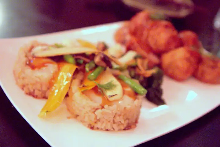 To start, Kurobuta pork gyoza ($7) are pan-seared dumplings exhibiting the right contrast of crispy and chewy, dipped in chili ponzu. A nabemono set ($19 regular/$24 large) comes with choice of meat, udon noodles and generous, assorted vegetables. I like shabu shabu choices of Washugyu beef or Kurobuta Berkshire pork in spicy miso broth – there’s also seafood (shrimp, salmon, scallops, clams) in dashi broth.