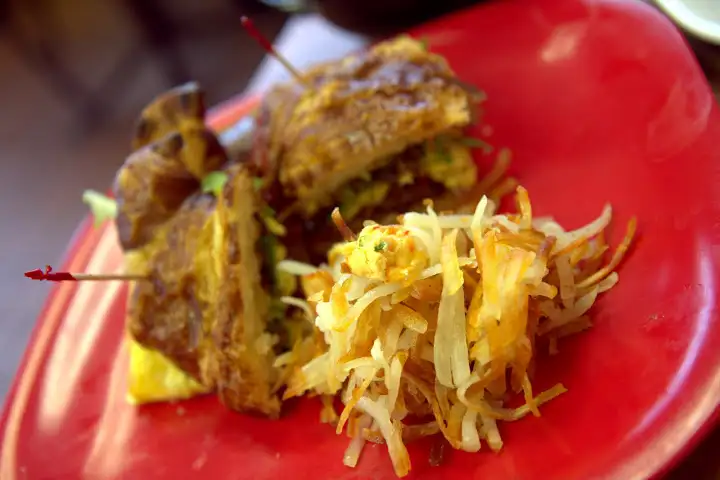 Superchefs, a divey breakfast-only joint that shares a space with Chicago Gyros (from 11am on) on lower Brownsboro Road and worth going out of your way for. Besides Hillbilly Tea (for cozy atmos and hipster-fied Southern food), Superchefs is my favorite Louisville breakfast spot. A pretzel croissant from beloved local German baker, Klaus Riedelsheimer, is packed with brown sugar candied bacon, egg and cheddar cheese and served with hash browns (8.50).