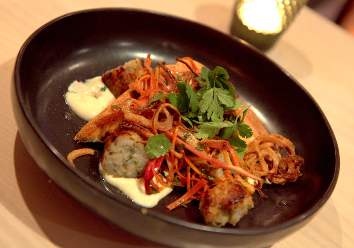 The wine list, from front-of-the-house manager Len Stevens, is categorized by flavor profile, from herbaceous to earthy, including cult California wines like LIOCO Chardonnay on tap. Starters illuminate the playful promise of the menu: deconstructed fried chicken and waffles ($7) line a dish, dotted with radish, dill and house butterMILK dressing. Rock shrimp sausage ($8) comforts on Texas toast slathered in Duke’s mayo, carrot slaw and herb salad.