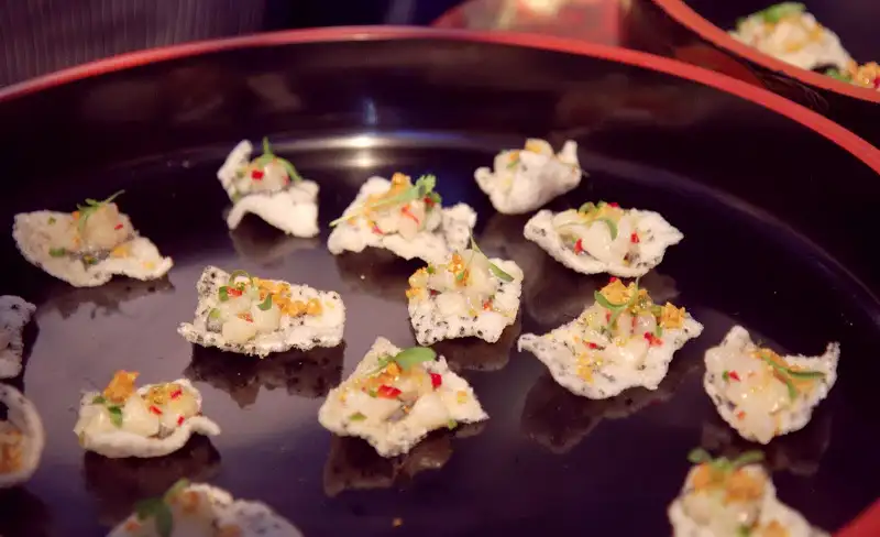 Betelnut’s raw day boat scallops marinated in nouc cham sauce with kaffir lime peanut brittle and sweet black sesame purée on black sesame rice crackers