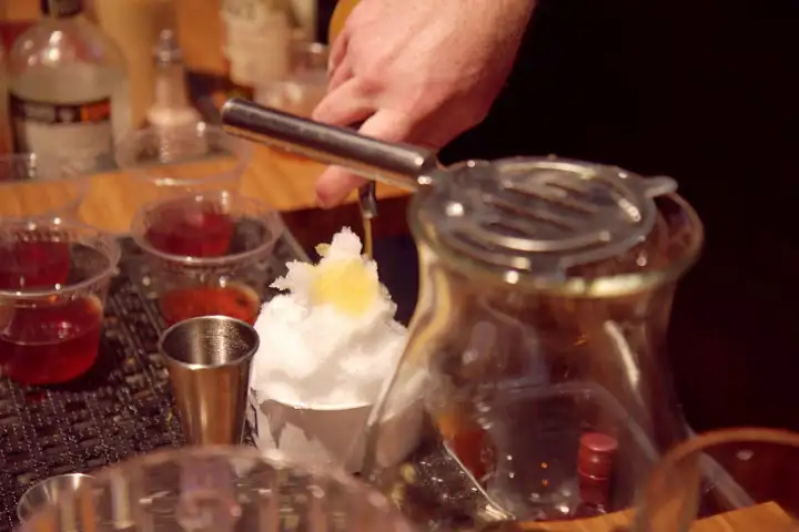 Rye on the Road presented a menu of four different (blissfully boozy) shave ices, including this winner of roasted cantaloupe syrup, poblano chili tincture, sweetened condensed milk, Espolon tequila