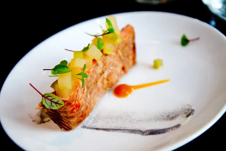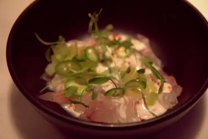 What at first glance appears to be the all too common menu item of recent years, a kale salad ($9), arrives with fresh perspective. Here raw kale is interspersed with coconut meat and Parmesan, tossed in a black garlic-lime vinaigrette. Another seemingly common dish is local halibut ceviche ($13), prepared like a silky halibut crudo, topped with a cube of compressed cucumber, silvers of serrano chilies and coconut milk. Similarly, a house-smoked salmon ($12) is almost meaty, itsl texture accented by burnt onion creme fraiche, ethereal with compressed apple and turmeric gel.