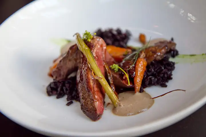 Take nothing for granted. That plate of pan-seared cauliflower ($9) is not just any old serving of the vegetable. Sweet cumin and lime pickle emulsion give it verve. Braised sturgeon ($18) makes an impression coated in black curry, resting on red basmati rice and garnished with crispy preserved maitake. Roasted squab ($17) is almost sexy with whispers of star anise, marked by plump blackberries over forbidden rice. Lamb-pork meatballs ($13) are crowd-pleasers – again, not so much traditional Middle Eastern or Spanish meatballs, but ones redolent of cinnamon, punctuated by green chickpea relish and spoonfuls of Straus yogurt.