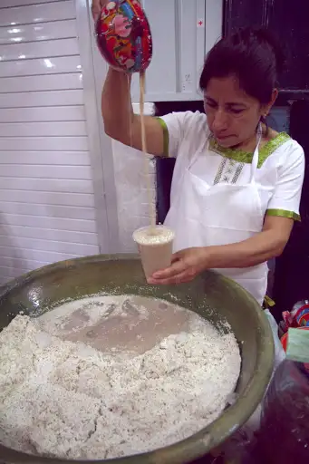 Elote (corn on the cob with mayo or creme fraiche and cayenne or chili powder) is served from street carts, as are cups of frothy champurrado (which I enjoy at home in SF), a chocolate-based atole (masa-based beverage), watery yet grainy with corn and spices like cinnamon or anise. Another fascinating Oaxacan drink is tejate, a cool elixir made from maize (yes, corn is a common drink ingredient), mamey pits, and fermented cacao bean with a cacao flower foam.