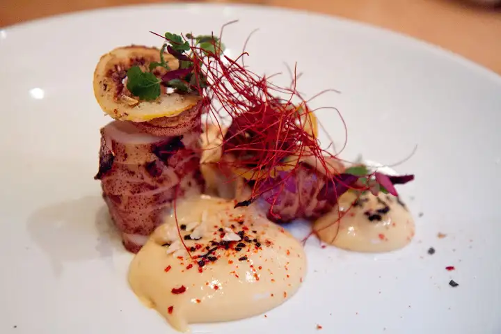Grilled squid ($13) is a bit of revelation, served in a form I haven’t not seen before. A fat tentacle is cut in segments, standing tall like a tower, topped with a grilled sliver of lemon, surrounded by mounds of smoked citrus sabayon (an egg yolk sauce) dusted with pepper powder. This dish stands out, but surprisingly, so do vegetables (generally $7). A vegetable tasting ($12) is the best way to try three of them at once: spiced roasted cauliflower, kale tossed with dates and puffed rice, and kimchee brussels sprouts. Each is spanking fresh, alive with flavor. This is the way to eat your veggies.