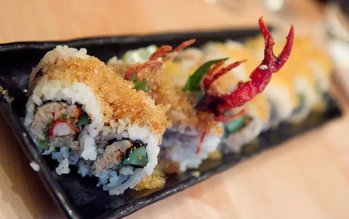 Ten piece sashimi platters ($32.50) or six piece sushi ($19.50) are sustainable “when possible” and pristine. Rolls/maki are not an afterthought, whether an elevated creamy scallop roll ($10.50) or the crisp of a spicy soft shell crawfish maki ($13.50), enhanced by cucumber, Japanese 7-spice, spicy crab and crawfish legs dramatically kicking out of the top.