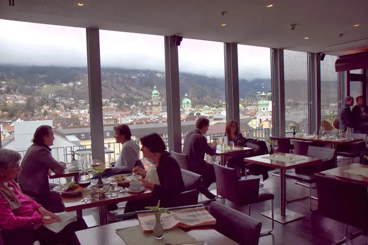 Slip into giant shopping mall, Rathausgalerien, off the city’s main square, Maria-Theresien-Strasse, and head to the top, 7th floor restaurant, Lichtblick, for inspiring 360° views of Innsbruck (360 the name of the circular, glass bar that shares a floor with the restaurant).
