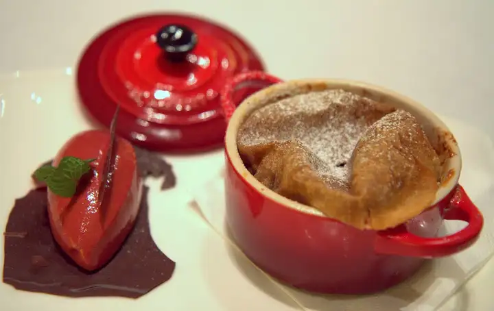 Surprisingly, dessert was the most memorable. A warm chocolate strudel arrives in a mini-red Le Creuset (12 Euro), the flaky folds of the pastry creating a dramatic image against the red, while a scoop of raspberry chocolate chili ice cream adds cooling flair. In November 2013, three courses of choice was 46 Euros, four was 56, 5 was 66, or order a la carte.